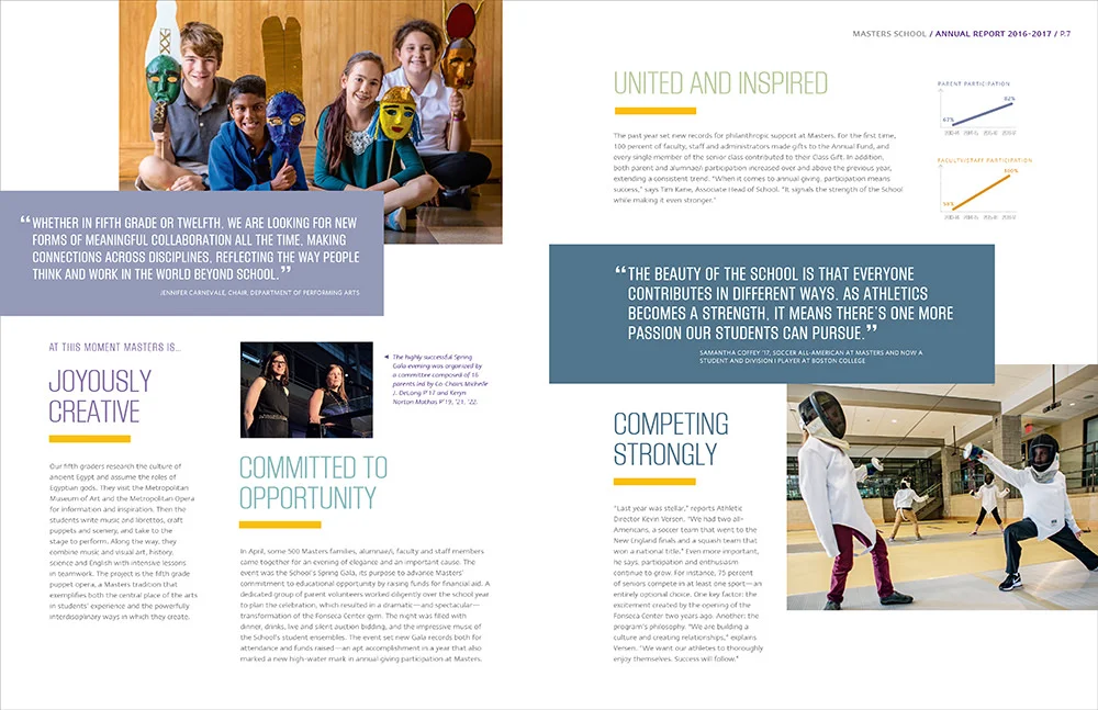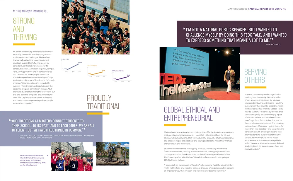 The look and feel of Penn Engineering, The Masters School’s Bulletin, Indy’s Spirit, and Pallium (the Canterbury’s School’s periodical) differ in ways that reflect the school’s individual identities. All, however, reflect several key approaches.